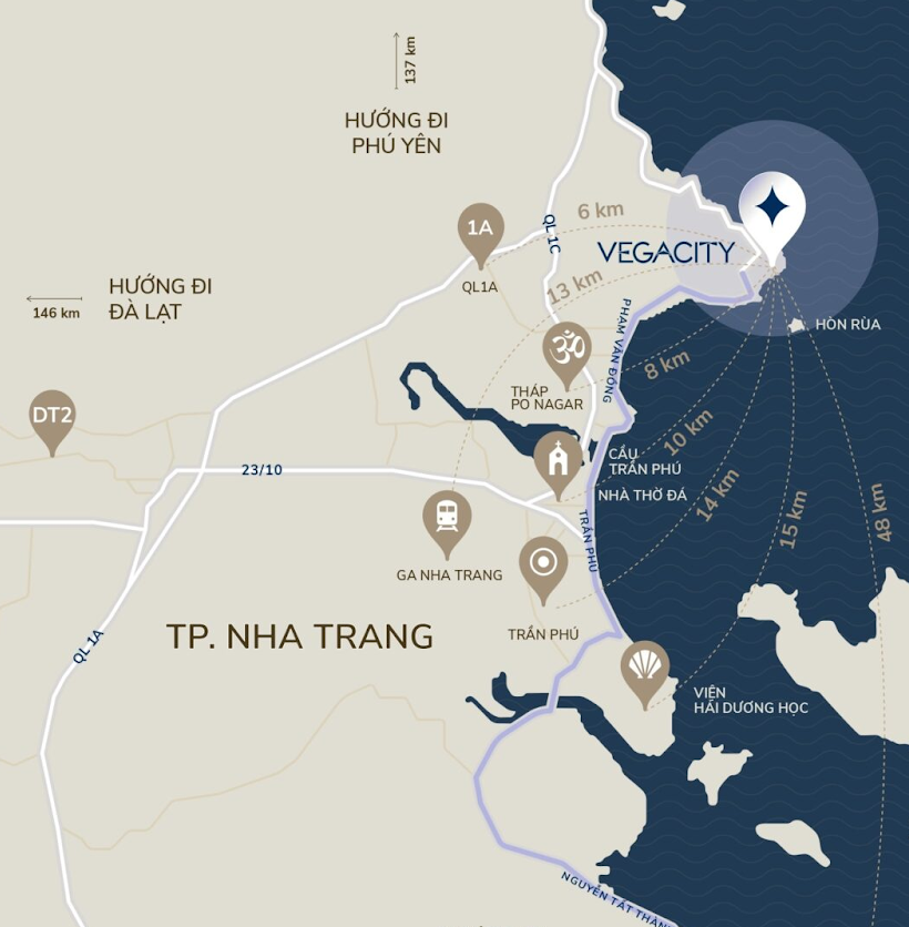 Với vị thế đắc địa hiếm có, chỉ cách trung tâm Trần Phú chưa đầy 15 phút lái xe, Vega City Nha Trang đủ gần để bạn hòa chung không khí sôi nổi của phố thị, nhưng cũng đủ xa để bạn tận hưởng một phong cách giải trí thượng lưu hoàn toàn khác biệt nơi trái tim mới của “kinh đô du lịch” Việt Nam.